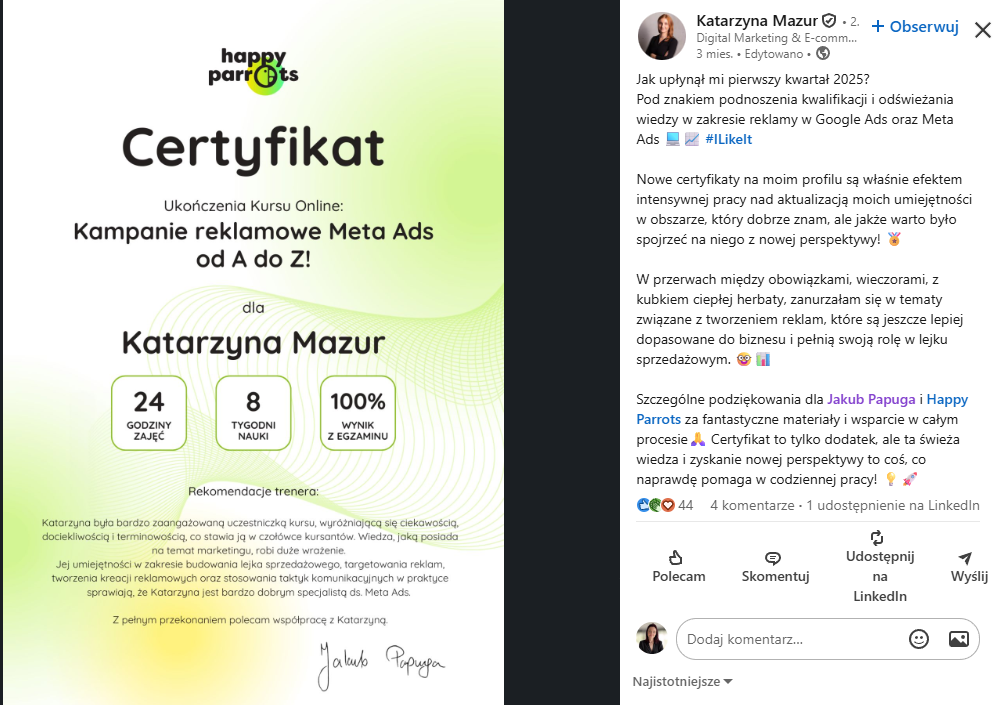 Certyfikat ukończenia Kursu Online: Kampanie reklamowe Meta Ads od A do Z! ma dużą wartość na rynku pracy, ponieważ, aby go otrzymać, nie należy wyłącznie ukończyć kursu, osoby które go posiadają, prezentują odpowiedni poziom wiedzy i umiejętności praktycznych.