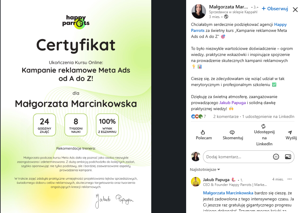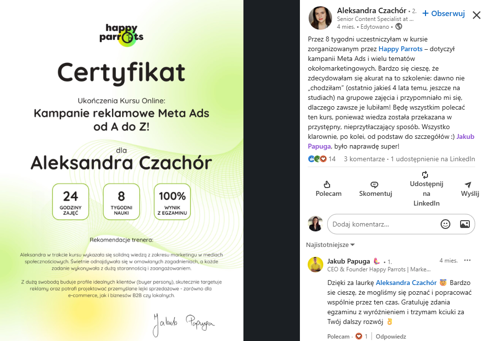 ✅ Możliwość stażu w agencji reklamowej Happy Parrots po ukończeniu kursu