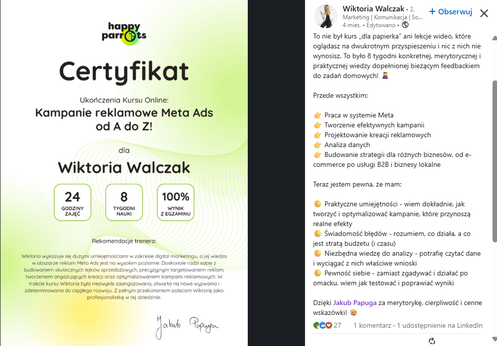 ✅ Certyfikat z podpisem i personalną rekomendacją trenera